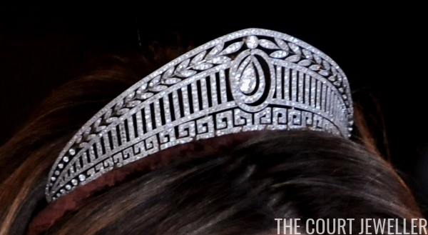 The Prussian Tiara: A delicate, low-profile kokoshnik featuring meander and laurel motifs, with a large pendant diamond in its center. Made by Koch in 1913. Given as a wedding present from Kaiser Wilhelm II of Germany to his daughter, Princess Viktoria Luise, Duchess of Brunswick. Passed to Queen Friederike of the Hellenes, and then to Queen Sofia. Worn by Princess Viktoria Luise, Duchess of Brunswick, Queen Friederike of the Hellenes, Queen Sofia, Queen Letizia, Infanta Elena, and Infanta Cristina. Worn as a wedding tiara by Queen Sofia and Queen Letizia.