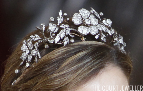 The Spanish Floral Tiara: A classic tiara of diamonds set in a naturalistic floral design, convertible for wear as a necklace. Made in 1879 by J.P. Collins. Given as a wedding present by King Alfonso XII to Queen Maria Cristina. Reportedly sold in the 1930s during the royal family’s exile. Acquired by Franco and presented to Queen Sofia as a wedding gift in 1962. Worn by Queen Sofia, Queen Letizia, Infanta Elena, and Infanta Cristina. Worn as a wedding tiara by Infanta Cristina.