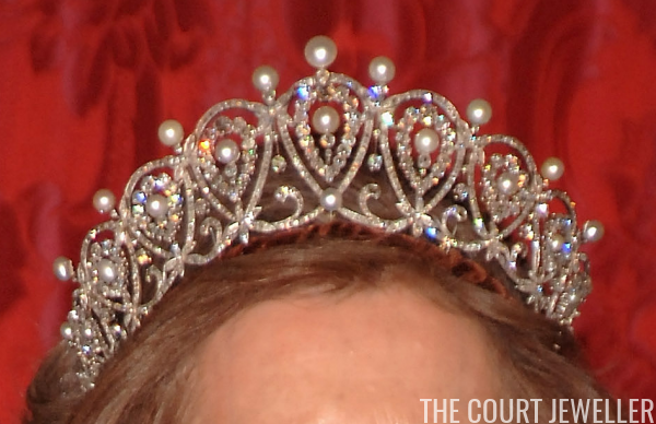 The Spanish Diamond Loop Tiara: A tiara of tall, looping diamond elements, topped by round pearls, and featuring elongated diamond and pearl clusters in their centers, set on a pearl-studded base of diamond scrolls. Made for Queen Maria Cristina. Inherited by King Alfonso XIII in 1929. Given as a wedding present to the Countess of Barcelona in 1935. Acquired by King Juan Carlos after his mother’s death in 2000. Worn by Queen Maria Cristina, the Countess of Barcelona, Queen Sofia, Infanta Pilar, Simoneta Gomez-Acebo y de Borbon, and Queen Letizia. Worn as a wedding tiara by Infanta Pilar and Simoneta Gomez-Acebo y de Borbon.