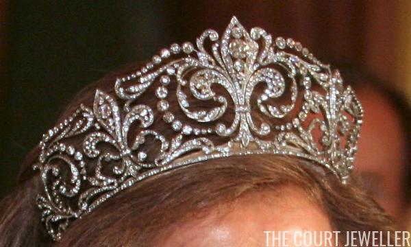The Asturias Fleur-de-Lis Tiara: A modern tiara of diamond scrolls with pearl toppers and a large central diamond fleur-de-lis element, detachable for wear as a brooch. Made by Ansorena in 2009. Worn by Queen Letizia.