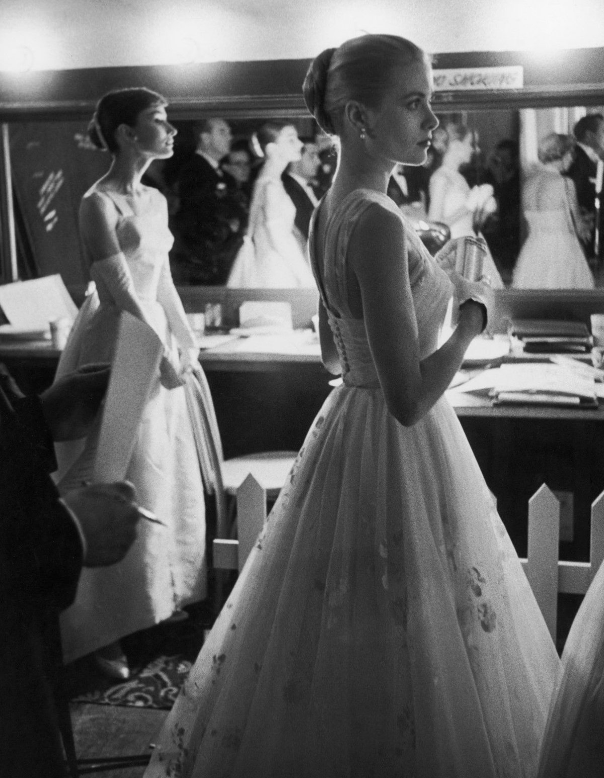 One of the most memorable moments from the 1956 ceremony was captured in this photograph, taken backstage during the ceremony. Grace waits for her turn to present beside another iconic star, Audrey Hepburn. Like Grace, Audrey was a presenter at the ceremony, not a nominee. She was the presenter for the Best Picture Oscar, which went to Marty.