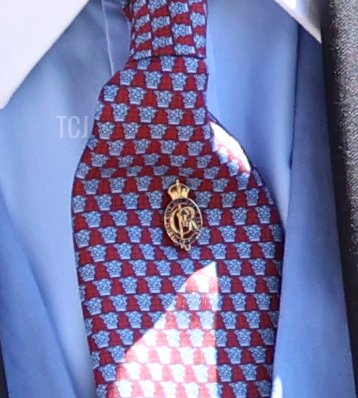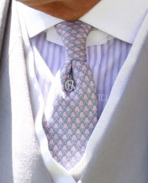 He wore another tie pin featuring a royal cypher set with diamonds and topped with a crown. I think the pin features the monogram of his great-grandfather, King George V (GVR).