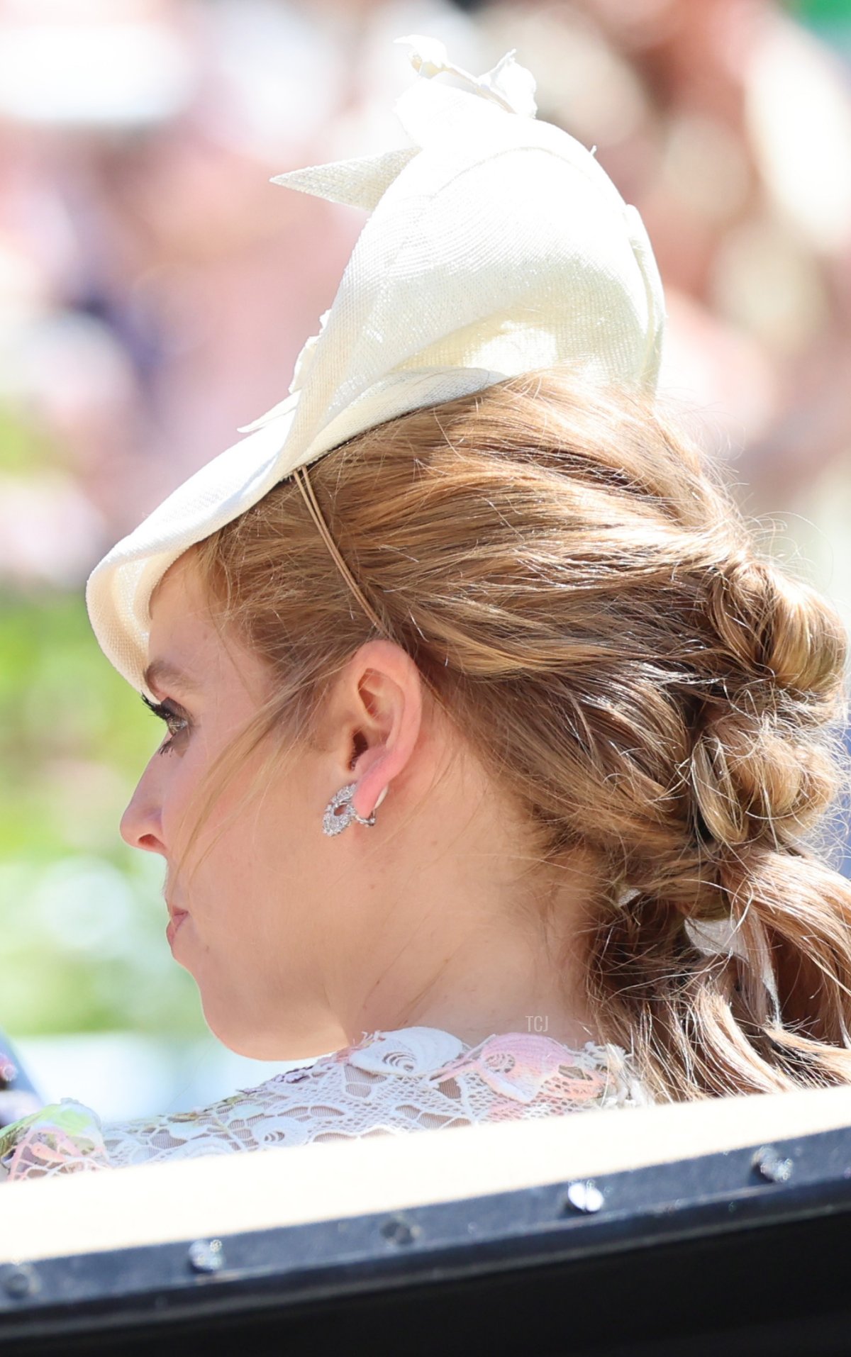 These crescent-shaped diamond earrings are clips—like Queen Camilla, Princess Beatrice does not have pierced ears.
