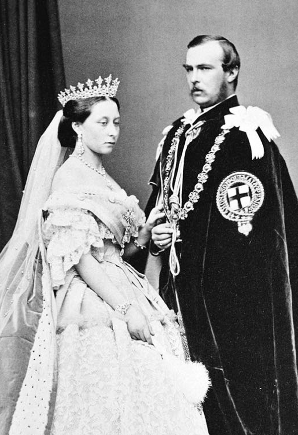 The jewels were given to Alice by her mother, who was careful to note the late prince consort’s role in their creation. Godey’s Magazine catalogues the piece among Alice’s wedding gifts: “a very beautiful tiara of diamonds, composed of a rich bandeau, with foliage, spires, etc., from Messrs. Garrard…designed…by his Royal Highness the Prince Consort.” Queen Victoria noted in her diary that the tiara had indeed been designed by Albert.