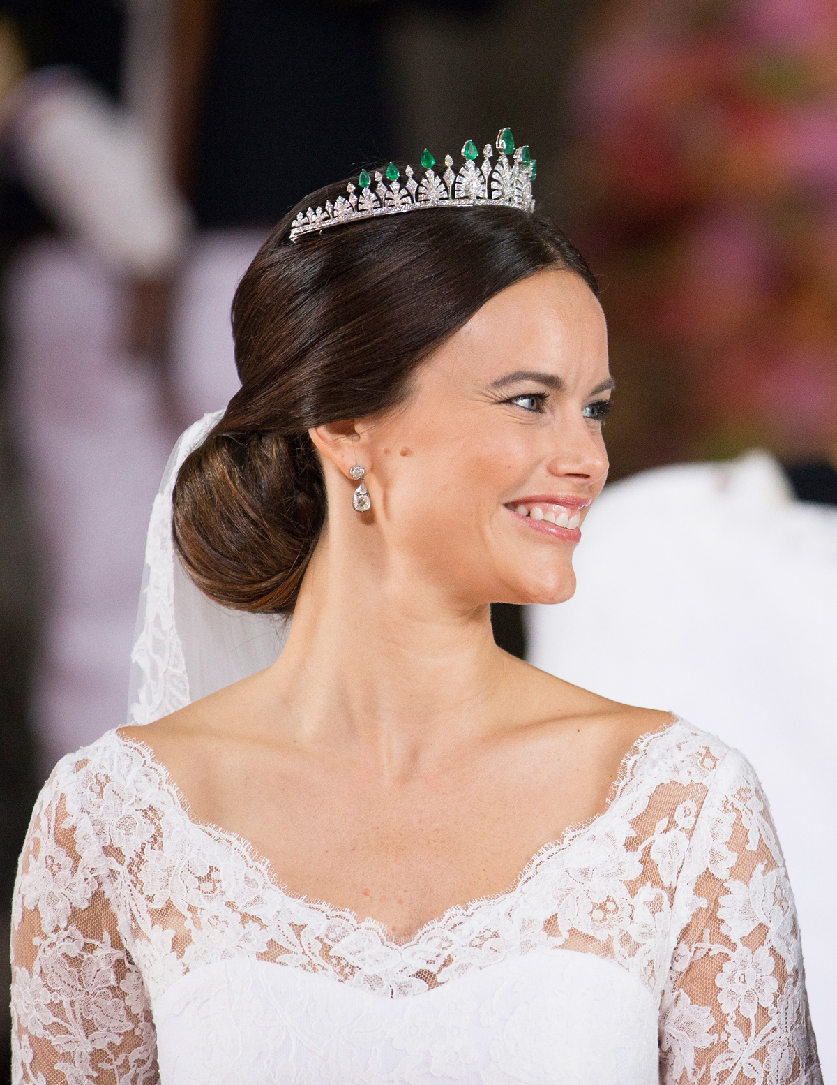 The bride wore a brand-new tiara for the wedding, reportedly a gift from the king and queen. It features a diamond base topped by a series of emeralds.