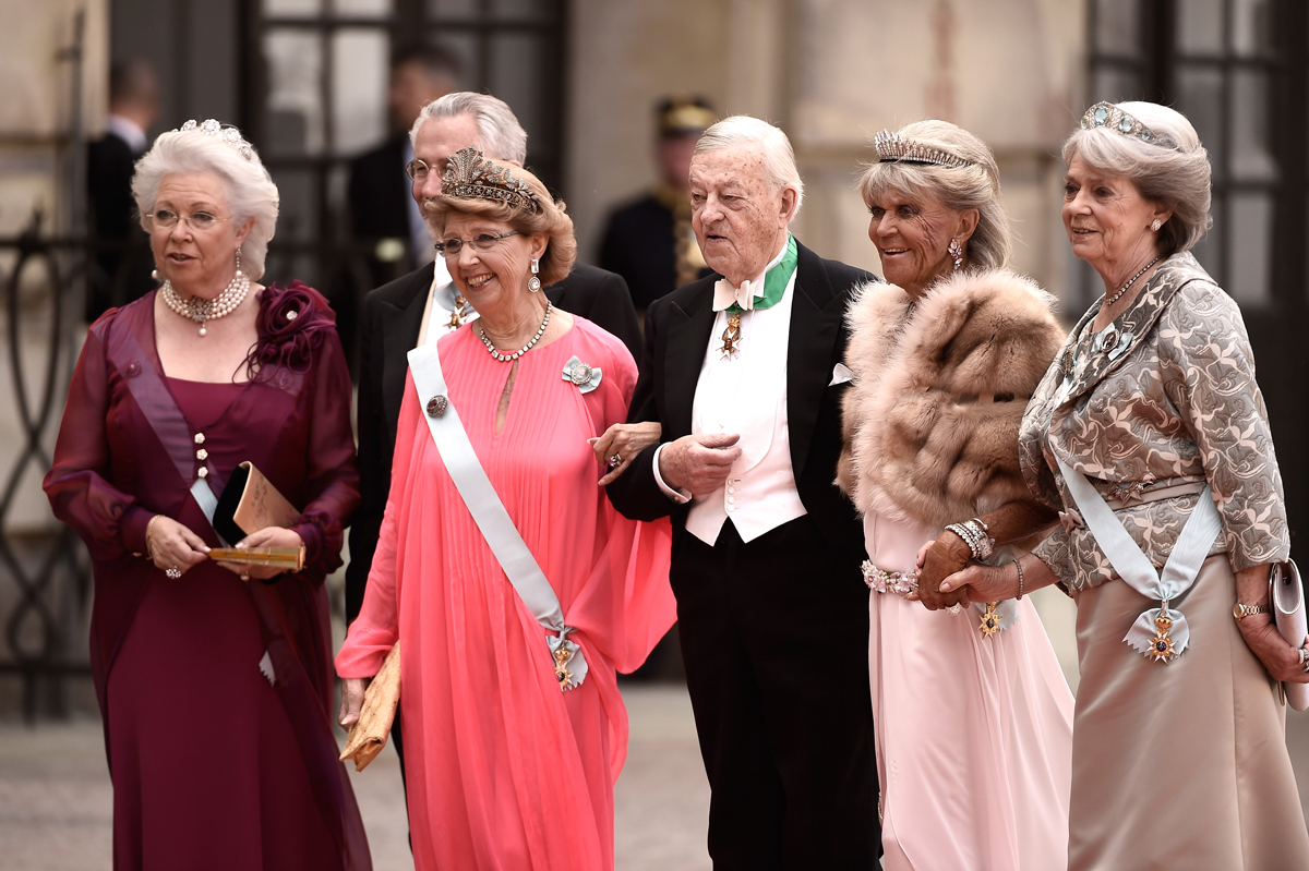 All four of the King’s sisters, the Haga Princesses, were there for their nephew’s wedding in Stockholm. All of them wore the sash and star of the Order of the Seraphim and their brother’s Royal Family Order.