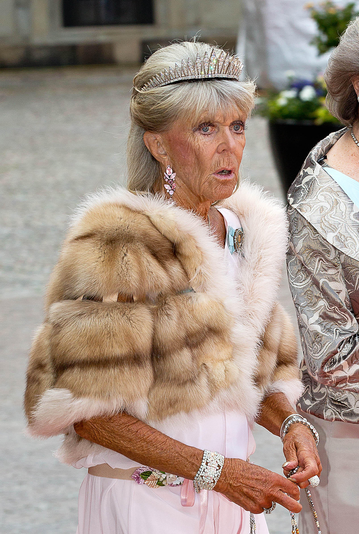 Countess Marianne Bernadotte of Wisborg, the widow of the king’s uncle, Count Sigvard, wore a diamond tiara with diamond and pearl jewelry.