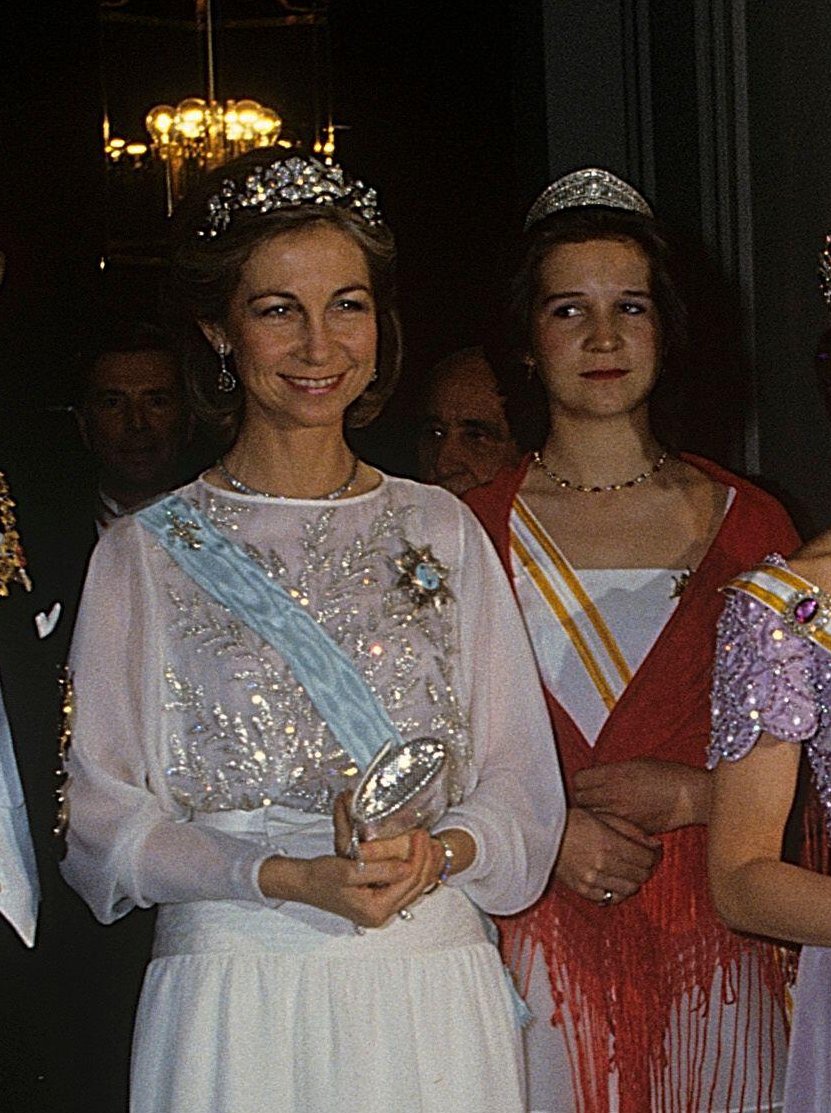 1983: Sofia lends the Prussian Tiara to her elder daughter, Infanta Elena, for the return banquet at the Swedish embassy in Madrid during a state visit from King Carl XVI Gustaf and Queen Silvia of Sweden.