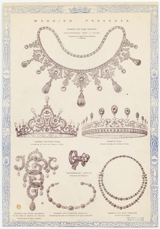 Queen Victoria, however, didn’t arrive at Buckingham Palace until the 21st. She spent only twenty-four hours in London during Maud’s wedding festivities. Victoria took the train from Windsor to London the afternoon before the wedding; after she arrived in the city, she stopped briefly at Marlborough House to inspect Maud’s wedding gifts. The jewels Maud received were impressive. At least three tiaras were on display: a pearl and diamond tiara from her parents (now lost; a replica is with the Norwegian royals), a diamond tiara from “lady and gentleman friends” (now with the Norwegian royals), and a convertible tiara/necklace from the English royal warrant holders.