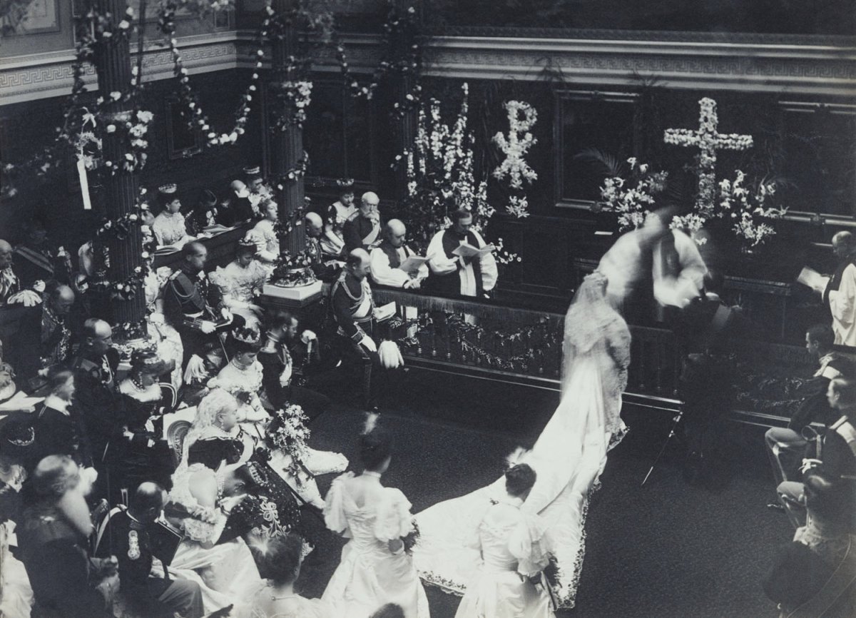 When the royals—with the exception of the bride’s procession—had gathered at the palace, Queen Victoria led the family into the private chapel. She was accompanied by two of her grandsons, Prince Arthur of Connaught and Prince Christian Victor of Schleswig-Holstein. When the Queen’s entourage had arrived in the chapel, the rest of the royals began to enter the room as follows: The Duke and Duchess of Teck; Prince and Princess Frederick of Schaumburg-Lippe; Prince Nicholas of Greece and the Duchess of York; the Duke of Fife and Princess Louise, Duchess of Fife; Prince and Princess Philipp of Saxe-Coburg and Gotha; the Duke and Duchess of Albany with Princess Elizabeth of Waldeck-Pyrmont; the Marquess of Lorne and Princess Louise, Marchioness of Lorne; Prince and Princess Christian of Schleswig-Holstein; the Duke and Duchess of Connaught; the Crown Prince and Crown Princess of Greece; the Duke of Cambridge and the Crown Princess of Denmark; and the Crown Prince of Denmark and the Princess of Wales. Prince Carl and his brothers entered the chapel next, heading up to the altar to wait for the bride.