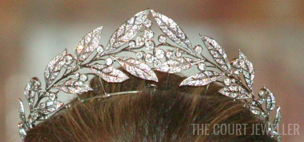 Beyond converting to a necklace, the tiara appears to be even more adaptable. Mathilde usually wears the tiara on a frame that sets it fairly high on her head. However, Mathilde has also worn the tiara closer to her head, suggesting that either the tiara can be positioned differently on the same frame or the piece came with more than one frame.
