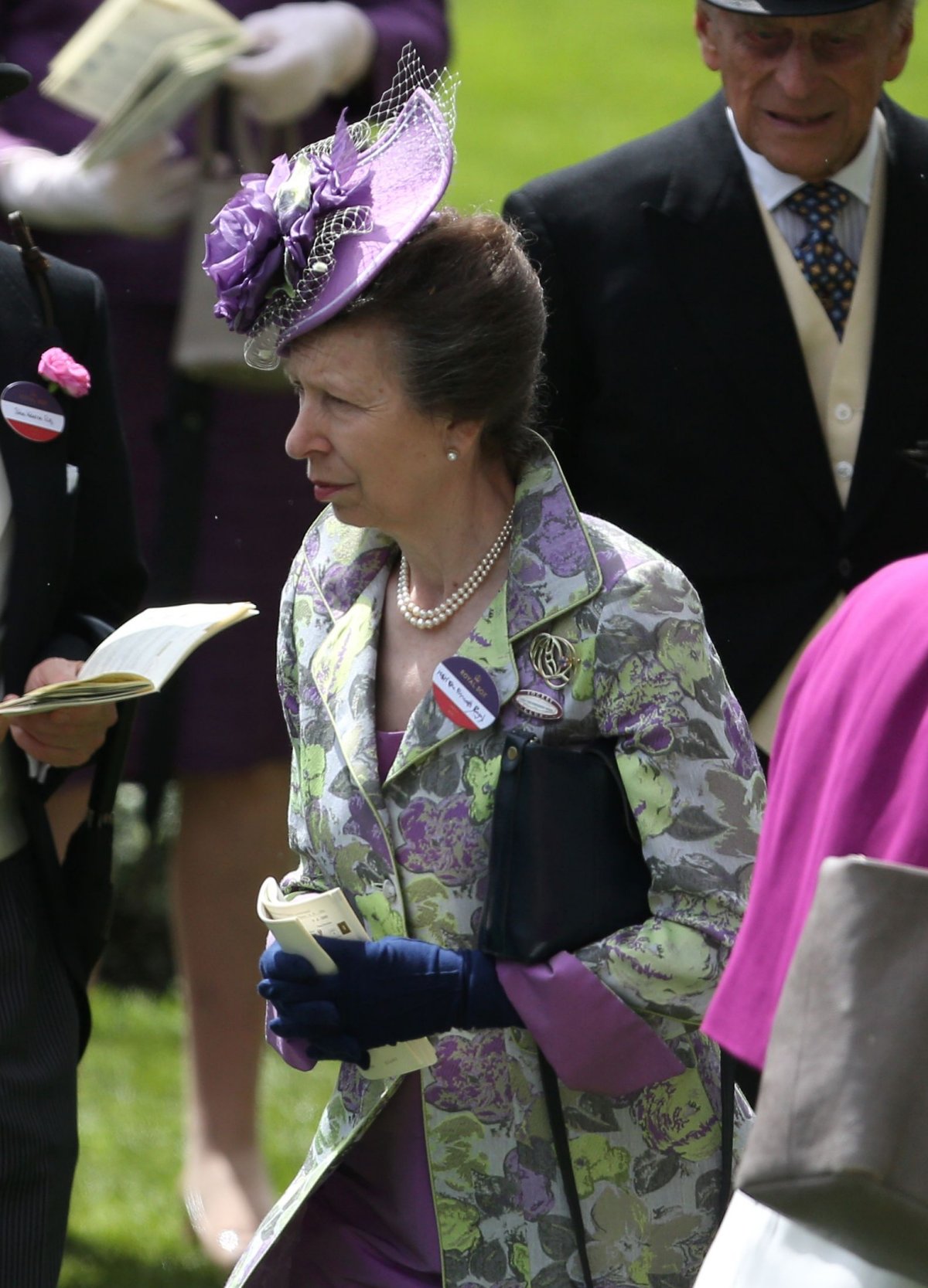 The Princess Royal repeated her outfit from the 2011 royal wedding, pairing it with pearl earrings, a pearl necklace, and an abstract gold brooch that looks to be set with an amethyst.