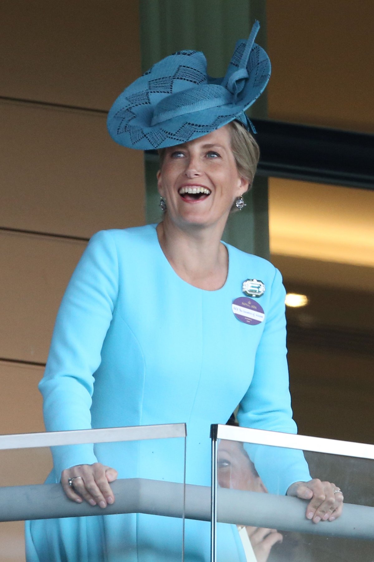 Sophie wore the same earrings that she wore at Friday’s St. Paul’s service, plus her Art Deco-style aquamarine brooch with the sapphire and diamond border.
