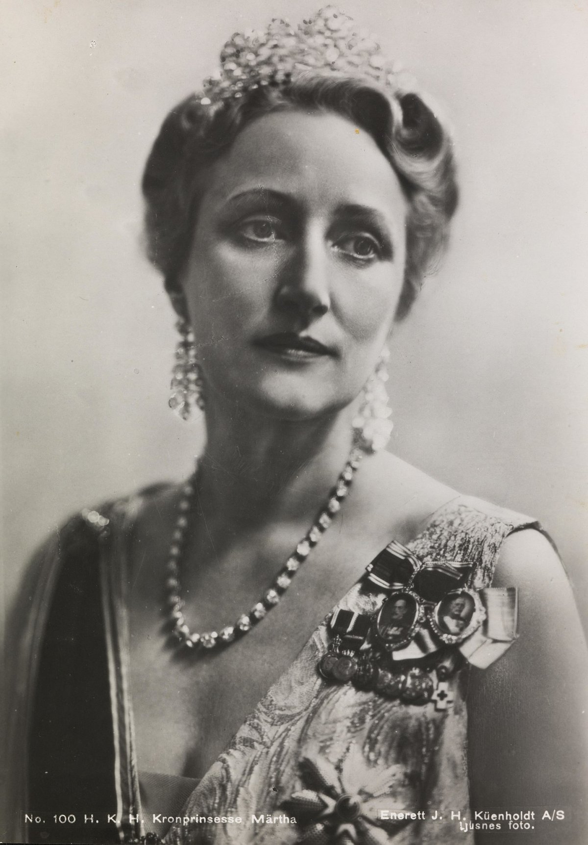 Prince Gustav did not marry and had no children of his own. When he died in 1944, he left the tiara to his niece, Princess Märtha of Sweden, who had married Crown Prince Olav of Norway in 1929. Crown Princess Märtha wears the tiara in this post-war gala portrait, paired with other family diamonds, including pendant earrings that belonged to Olav’s grandmother, Queen Alexandra of the United Kingdom.