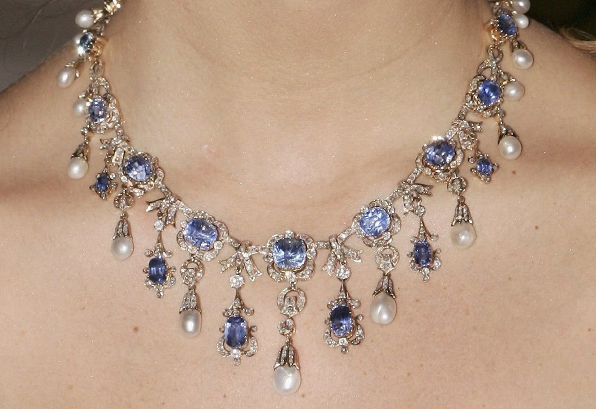 The recipient of this astonishing necklace, which is made of gold, diamonds, pearls, and pale blue Ceylon sapphires, was Victoria of Baden. She was the daughter of Friedrich I, the Grand Duke of Baden, and Princess Louise of Prussia (who was a sister-in-law of Princess Vicky, the eldest child of Queen Victoria and Prince Albert).