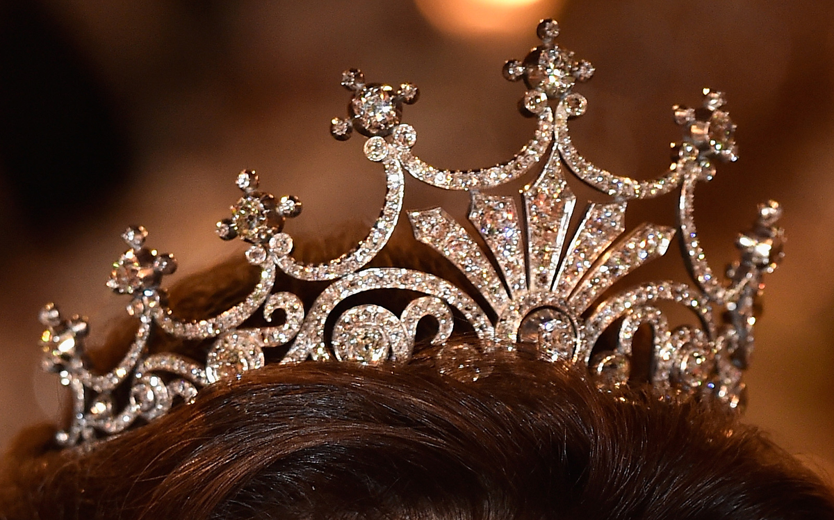 This sunrise-and-sea design is surmounted by a series of diamond swags or festoons, each of which is topped by a collet set diamond. Each of these large diamonds (which appear to be cushion-cut stones) has three smaller diamonds radiating outward, creating the “prong” designs that are the tiara’s visual signature to so many.