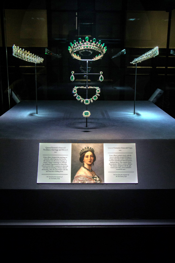 All of the jewels that have been newly placed in the exhibition belonged to members of the British royal family. The diamond and emerald tiara, as well as its accompanying parure, were all owned and worn by Queen Victoria. The two all-diamond tiaras on display belonged to her granddaughter, Princess Louise, Duchess of Fife.