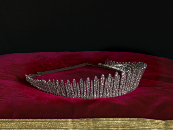Designed by Oscar Massin, the tiara was a wedding present given to Princess Louise of Wales, daughter of King Edward VII and Queen Alexandra, by her new husband, the Duke of Fife, in 1889. A special issue of The Graphic, published in August 1889 to celebrate the Fife wedding, described the tiara as follows: “in a very uncommon and beautiful design, composed of hundreds of stones, ranging in weight from one carat to ten, the larger being what are technically known as briolettes—that is cut on both sides and turning on pivots so that they will flash with every movement of the head.” Another contemporary news report describes the tiara given by the duke as “a mass of diamonds, and one of the most valuable pieces of work in England.”