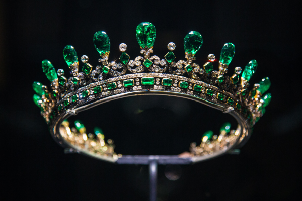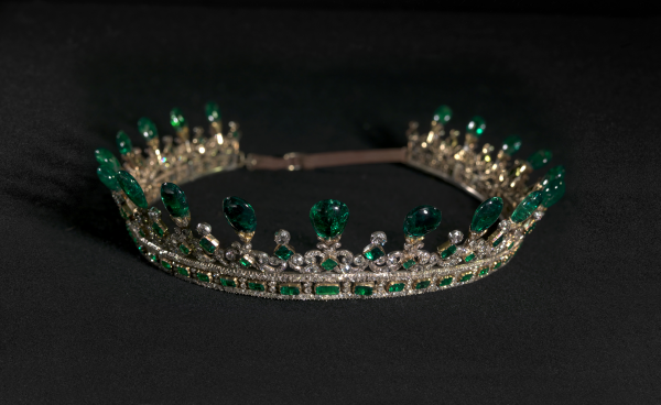 In a press release for the new exhibition, Historic Royal Palaces describes the tiara as “set with cushion-shaped diamonds and step-cut emeralds, and surmounted by a graduated row of 19 inverted pear-shaped emeralds, the largest of which weighs an astonishing 15 carats.”