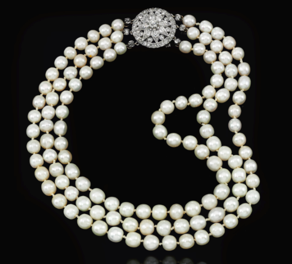 Lot 97, which is estimated to sell for between $202,350 and $303,525, includes 119 of the 161 pearls from the original necklace. That original necklace was restrung as a sautoir in the early 20th century, and then restrung again into this three-row necklace, which features a large diamond clasp, and a separate single-stranded necklace.