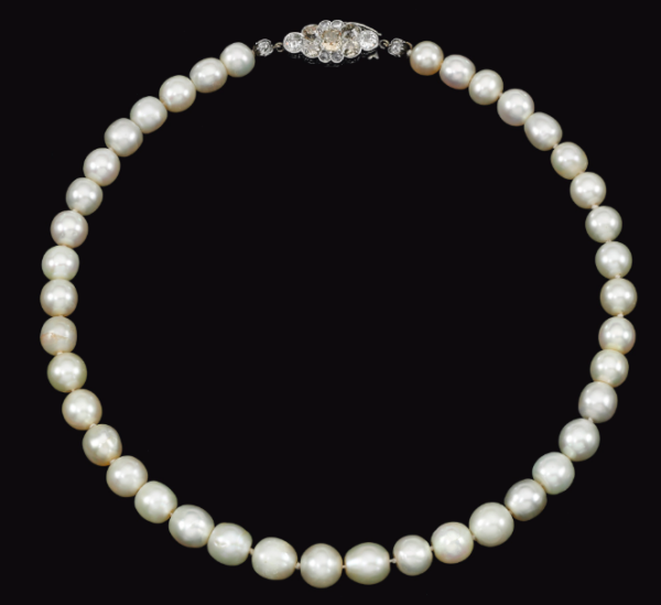 Lot 98 is that single-stranded necklace, which is estimated to sell for between $40,470 and $70,823. It features 40 pearls and a detachable diamond clasp. The lot notes indicate that 39 of the pearls are natural saltwater and one is cultured.