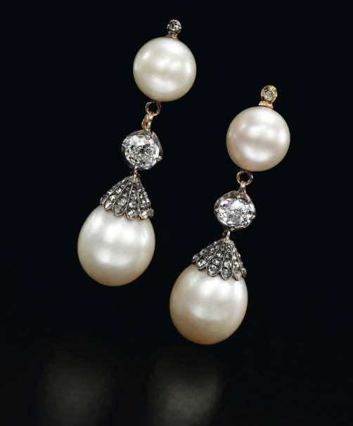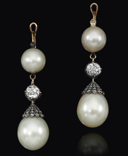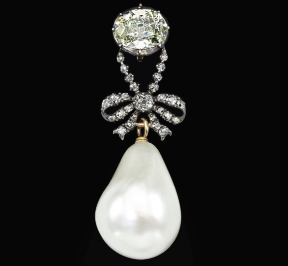 The earrings from the parure are presented as lot 99 in the auction, and they’re estimated to bring between $202,350 and $303,525. The earrings are described as follows in the lot notes: “Each surmount set with a button shaped natural pearl measuring approximately 12.65 x 12.95 x 15.60mm and 12.95 x 13.10 x 16.00mm respectively, the reverse set with rose diamonds, supporting a detachable pendant set with an oval natural pearl measuring approximately 10.25 x 10.50 x 8.55mm and 10.15 x 10.20 x 7.70mm respectively, capped with rose diamonds, and a pinched collet-set cushion-shaped diamond.” The notes also indicate that the earrings feature “early 19th century, hook and hinged back fittings,” which naturally would have been added after Marie Antoinette’s death.