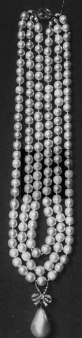 Two generations later, the pearl suite was recorded in a jewelry inventory compiled by Archduchess Maria Anna of Austria, the wife of Louise’s grandson, Prince Elias, Duke of Parma. She noted that the “grande parure de perles” that belonged to Marie Antoinette included a necklace with three rows of round pearls, with a pearl pendant suspended from a diamond bow, and fastened by a a diamond clasp. The necklace as described by Maria Anna is pictured above.