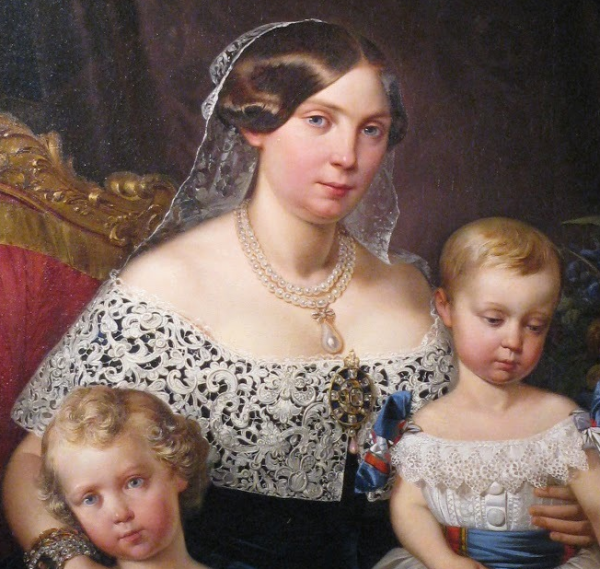 Marie Therese did not have any children of her own, but she did have a niece and a nephew, the children of Louis Antoine’s brother, the Duke of Berry. Her niece, Princess Louise, married the Duke of Parma; she’s the one who inherited the pearl suite, which remained with her descendants until this year. Look closely at the portrait above, and you’ll see Marie Antoinette’s pearl necklace and pendant around Louise’s own neck.