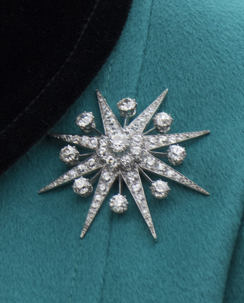 Here’s what Field tells us about the brooch: “In 1981 the Queen was left a late-Victorian diamond star brooch by Lady Jardine, which she has worn on many occasions. It has a collet diamond on a knife-wire between each of its eight points.” No information is given regarding the maker of the brooch.