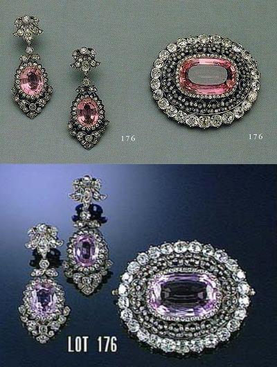 The jewels are serious antiques, made around 1830. The design of the pieces, especially the cluster setting of the brooch, is definitely typical of that era. The earrings and brooch were sold at Sotheby’s in London in June 2000, and in those auction notes, the firm speculates that the jewels might have once been part of a much larger parure. (That also makes a lot of sense, given the time when they were made.) The jewels sold for £22,925.