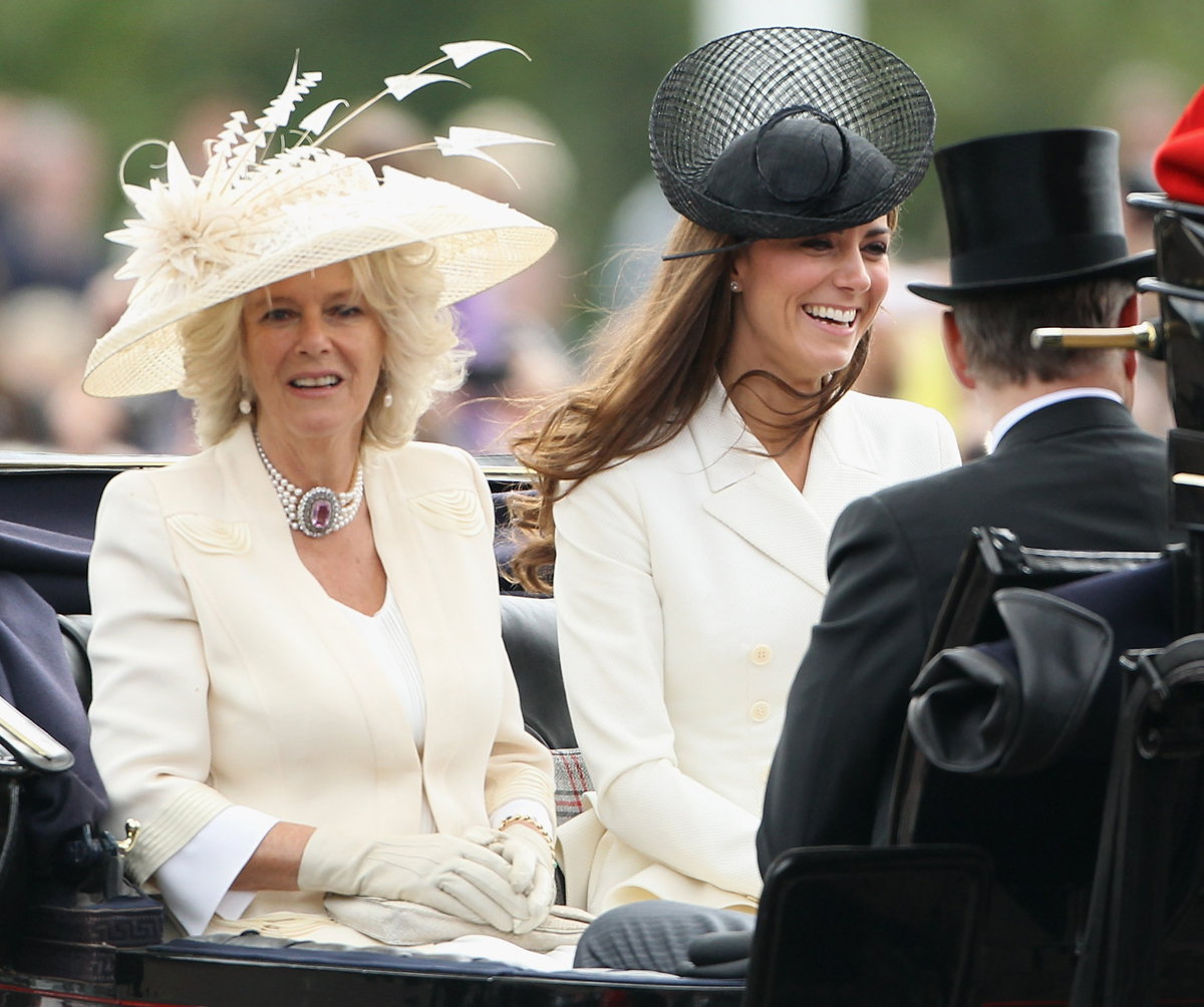 …and in June 2011, when she rode in a carriage beside the newly-minted Duchess of Cambridge. She paired the brooch with pearl earrings on both occasions.