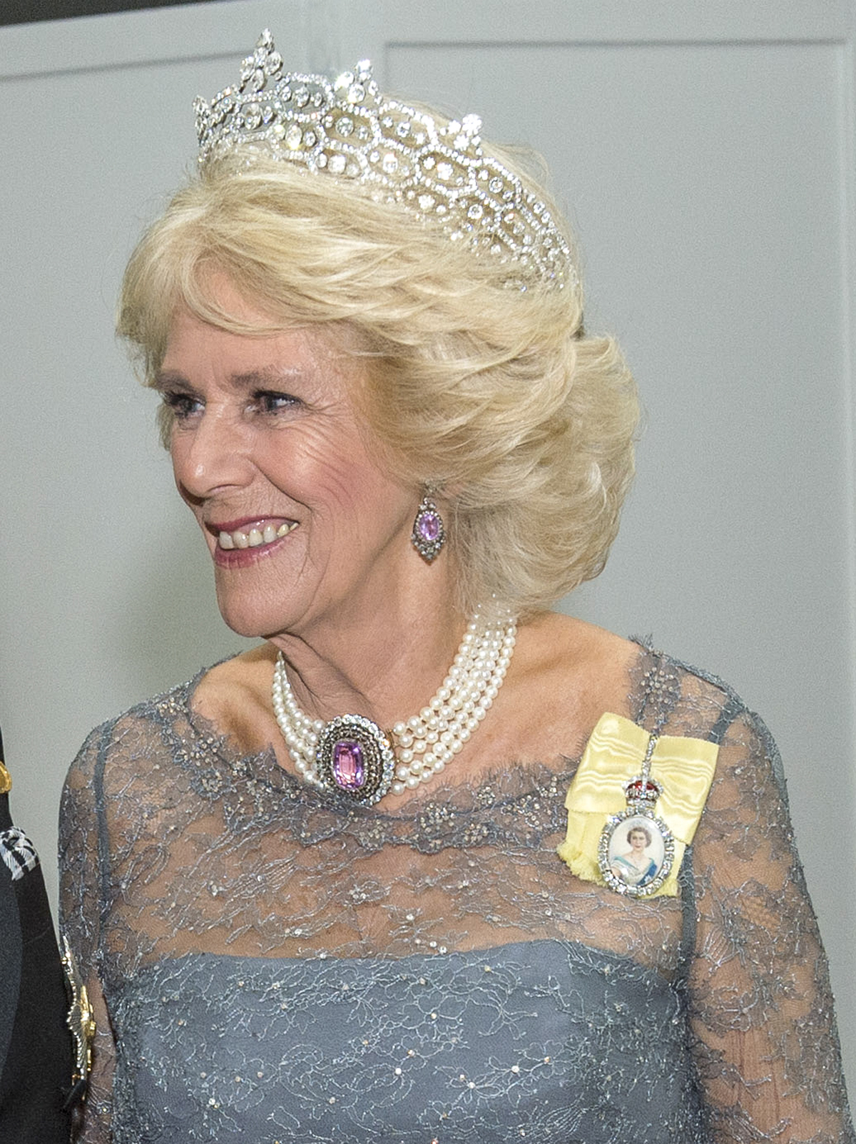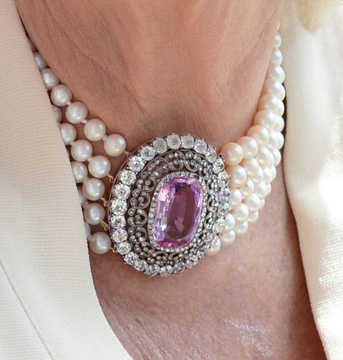 Regardless, we know for certain that Camilla had the jewels in her possession by 2006. She began wearing the earrings, as well as the brooch as the clasp on a pearl necklace, the same year. Initially, she wore the jewel as the clasp on a longer pearl necklace, but by 2008, she had begun wearing it in the form we find most familiar today: as the clasp on a five-stranded pearl choker necklace.