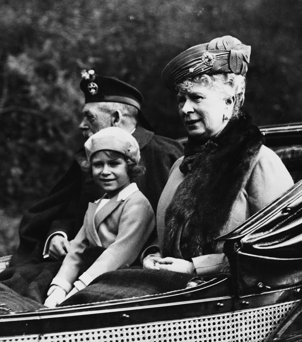 The brooch belonged to Queen Mary, who liked to wear it on her coats and her hats. Here, in a charming photograph with King George V and a young Queen Elizabeth II, Mary wears it pinned to her hat. The photo was taken in August 1935, in the last summer of George V’s reign, as the royal party was returning to Balmoral Castle from nearby Crathie Kirk.