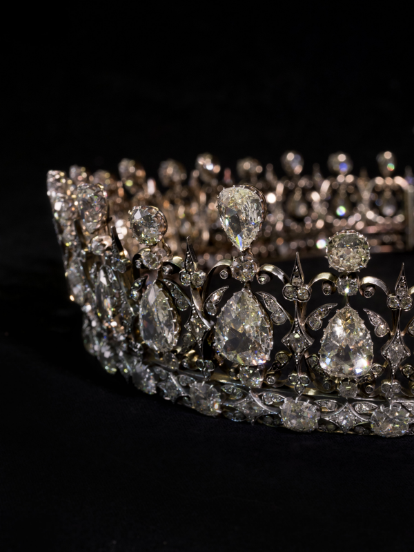 It seems extremely likely that the tiara was constructed based on a design by Oscar Massin, who had exhibited a very similar piece at the Exposition Universelle in Paris in 1878. Massin didn’t generally produce his tiara designs himself; instead, he partnered with other jewelry firms who executed the pieces he’d created. However, the maker of this tiara has never been positively identified.