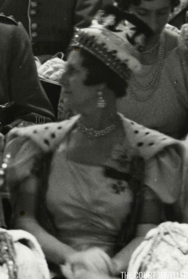 And here’s a view of Alexandra wearing the tiara in Westminster Abbey during the 1937 coronation itself. She’s scowling a little in the image—believe it or not, the face is directed at her sister, Princess Maud, who is blowing her nose in another part of the royal gallery (!). At this angle, you also get to see how the Fife Tiara looks when worn with a coronet.