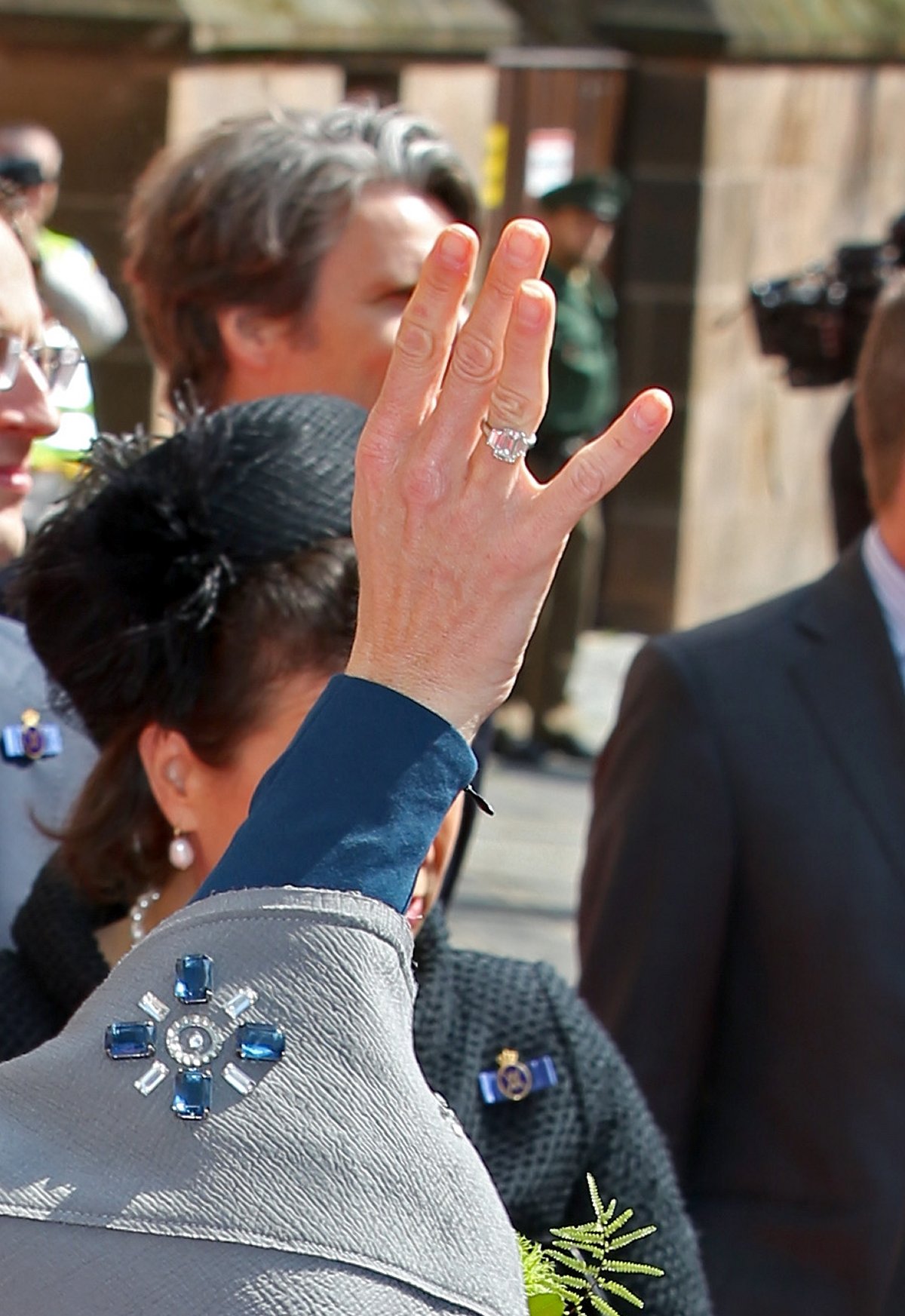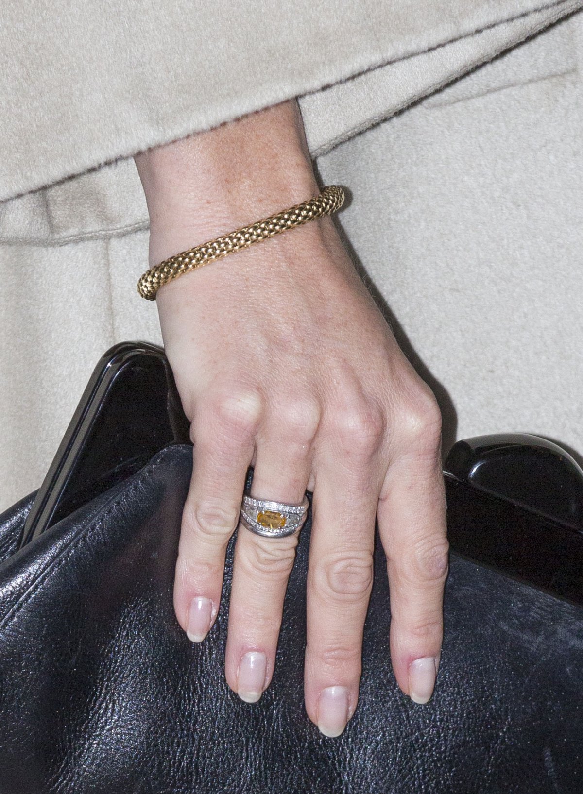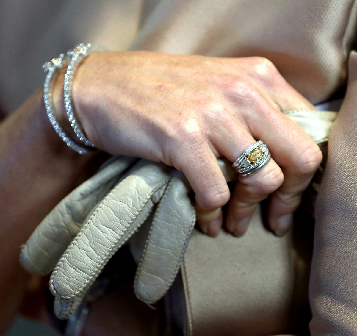 While many royals wear their engagement ring exclusively on one hand (usually the left), Maxima has been photographed wearing her ring on both her left and right hands. This may be because of the blended traditions that Maxima and Willem-Alexander have brought to their family. In the Netherlands, Catholic people often wear their rings on their left hands, while Protestants often wear the rings on their right hands. Willem-Alexander is Protestant, while Maxima was raised in the Catholic Church. Above, Maxima wears her engagement and wedding rings together on her left hand.