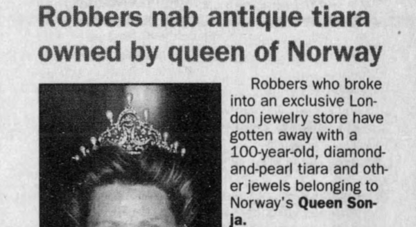 The timing of the tour may give us some idea of why Princess Martha Louise would loan a tiara to her mother, whose jewelry box includes several important royal treasures. Earlier the same year, in February 1995, several pieces of Norwegian royal jewelry had been taken to Garrard in London to be cleaned. Thieves broke in to the firm’s showroom and workshop and made off with a bag containing several pieces of jewelry that belonged to Queen Sonja, including the diamond and pearl tiara that had been one of Queen Maud’s wedding presents.