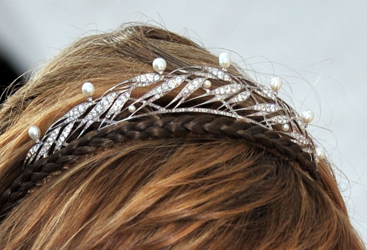 Here’s a closer look at the tiara, which features twisted diamond elements resembling grass or wheat, topped by delicate pearls.