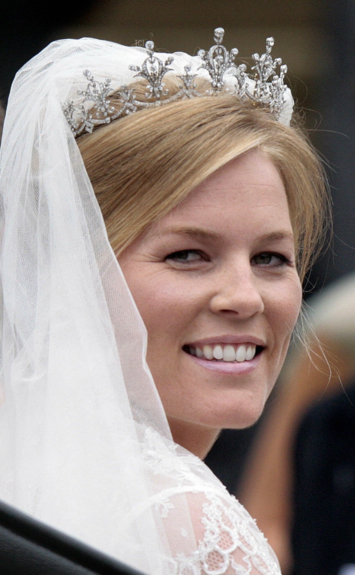 Autumn kept her jewelry on the simple-but-beautiful side for the wedding. Her major accessory was Princess Anne’s Festoon Tiara, which was loaned to her for the day by her mother-in-law, the Princess Royal.