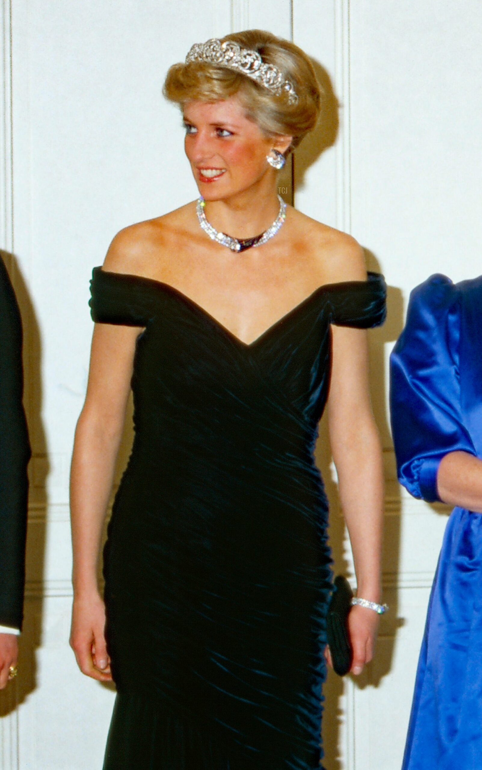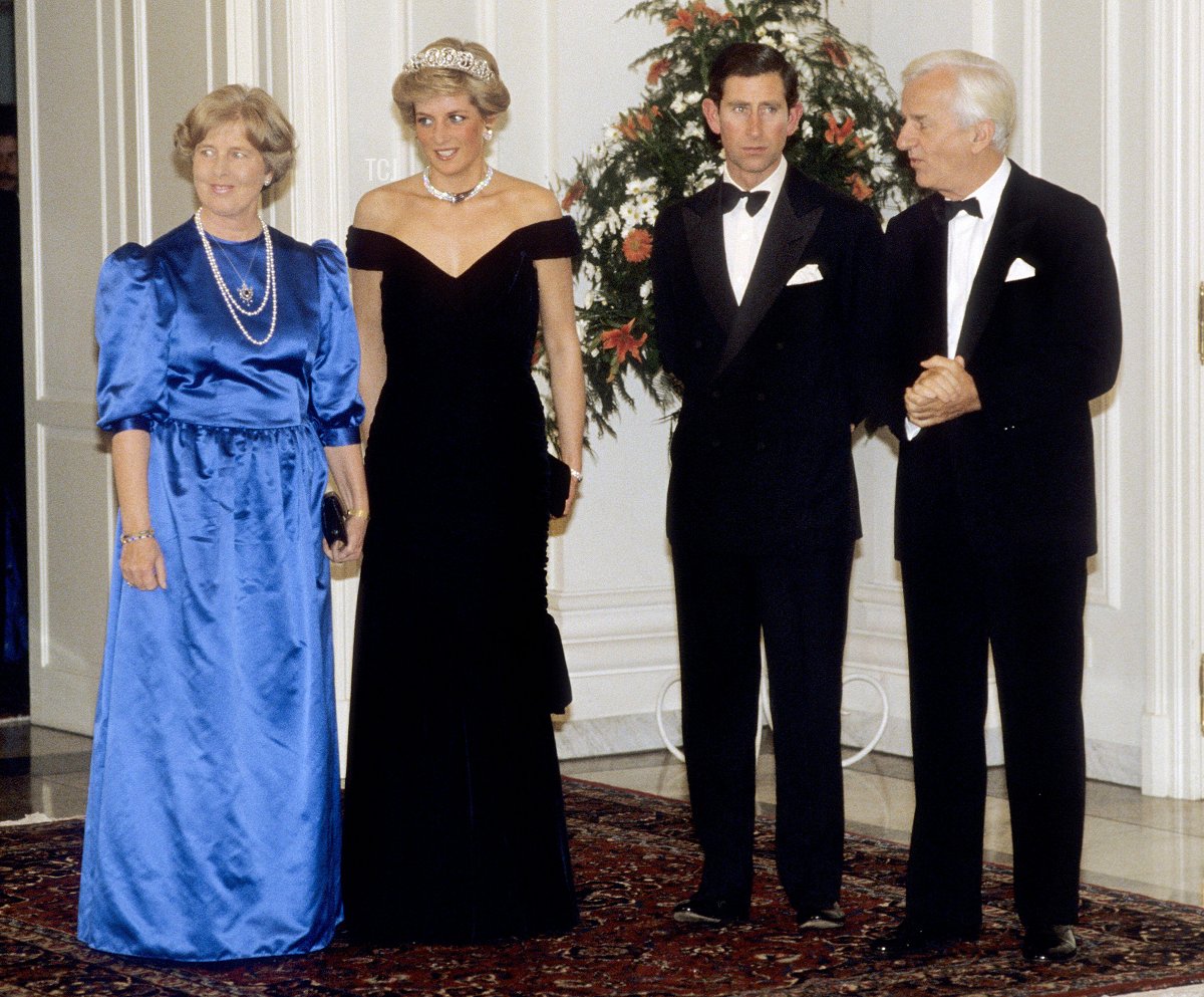 The midnight blue velvet gown that Diana wore for the dinner probably also looks very familiar to you. And it should: it’s the famous Travolta Dress, made by Victor Edelstein. Diana debuted the dress at the White House in Washington, D.C., in November 1985, memorably dancing with actor John Travolta during the gala evening. The gown is now in the collection of the Historic Royal Palaces charity, which manages the public rooms of Kensington Palace, among other royal buildings.