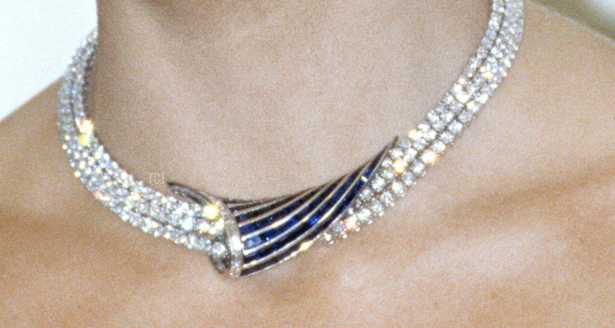 Diana wore the complete Oman Sapphire Suite for the occasion: you’ll be able to see the necklace, earrings, and bracelet, worn on her left wrist, in this image.
