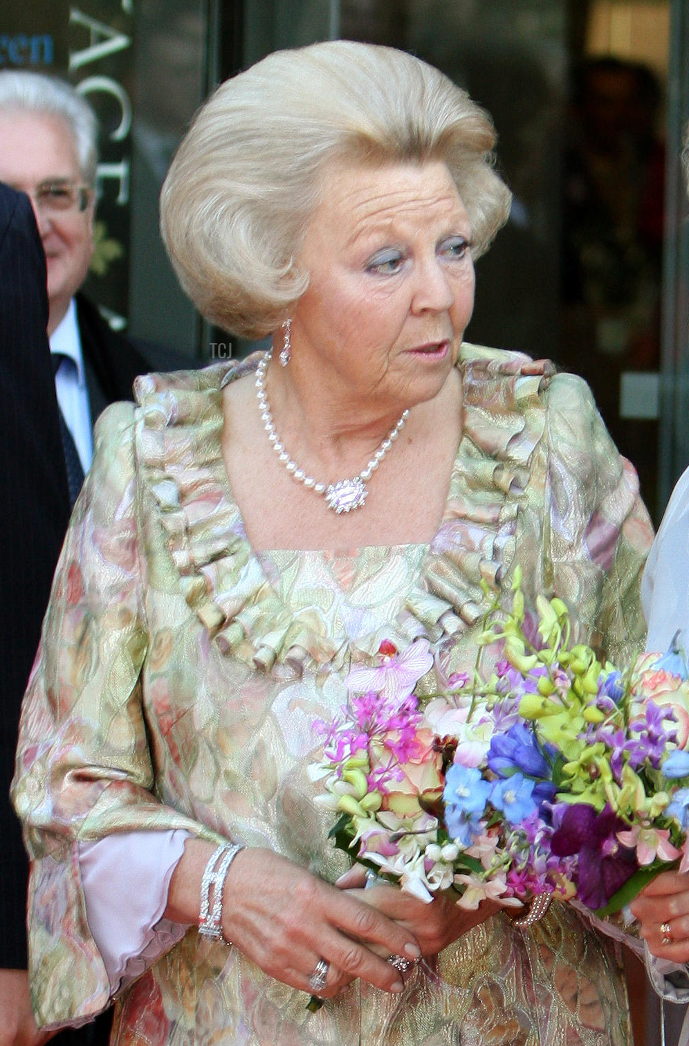The kunzite jewels first appeared in public around a decade ago. In June 2009, Queen Beatrix of the Netherlands wore parts of the set, including the earrings and the ring (partially obscured here, on her left hand), for the opening of the Hermitage Museum in Amsterdam. She also used the top portion of the brooch as an enhancer on a pearl necklace. (On her right wrist, she’s wearing one of the Dutch East Indies Bracelets, and you’ll also be able to spot a pearl bracelet on her left wrist. Her wedding and engagement rings are on her right hand.)