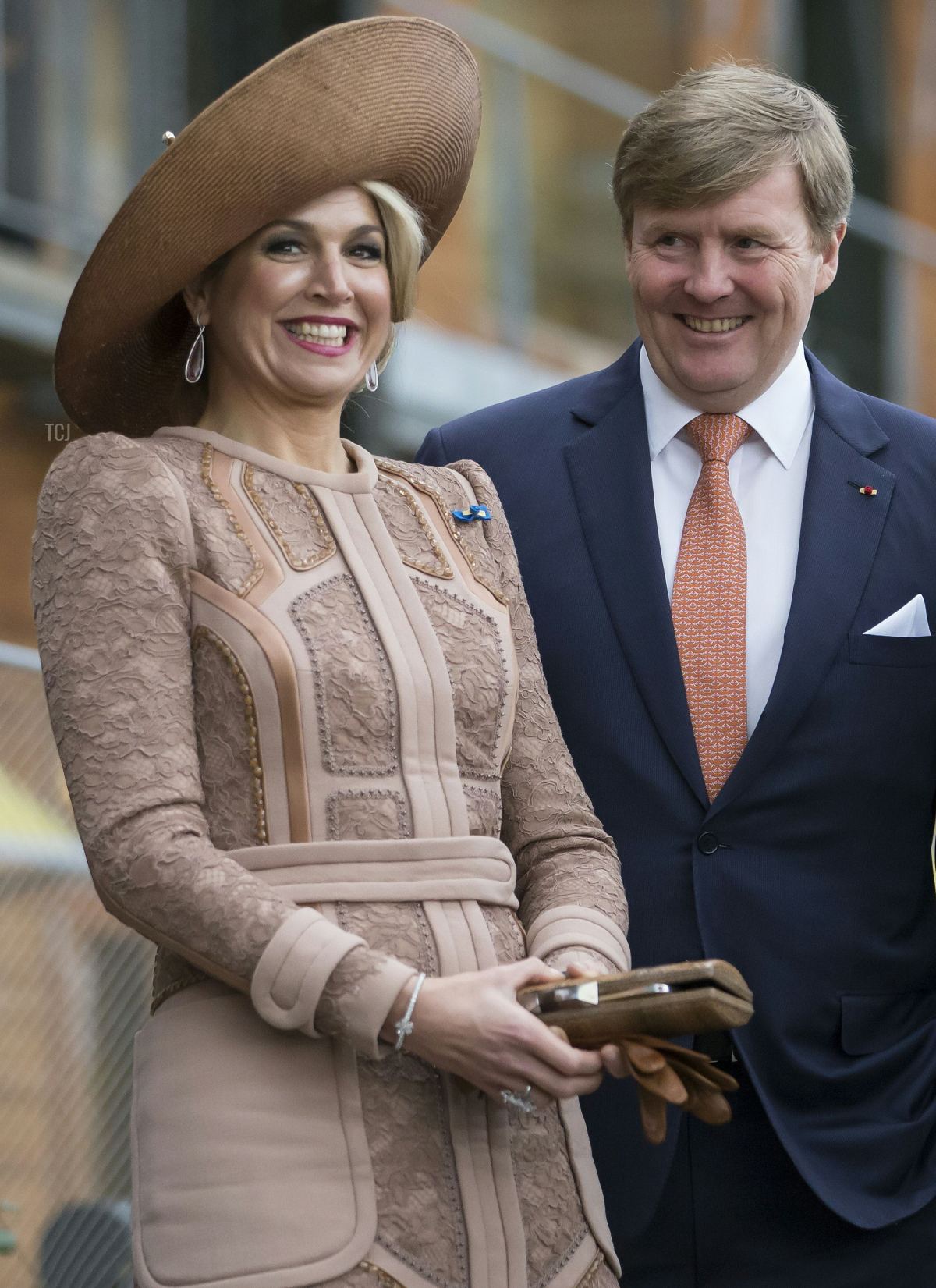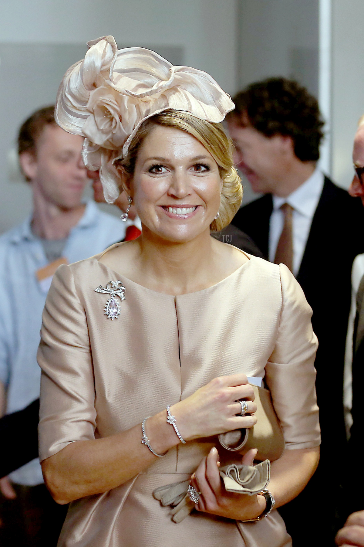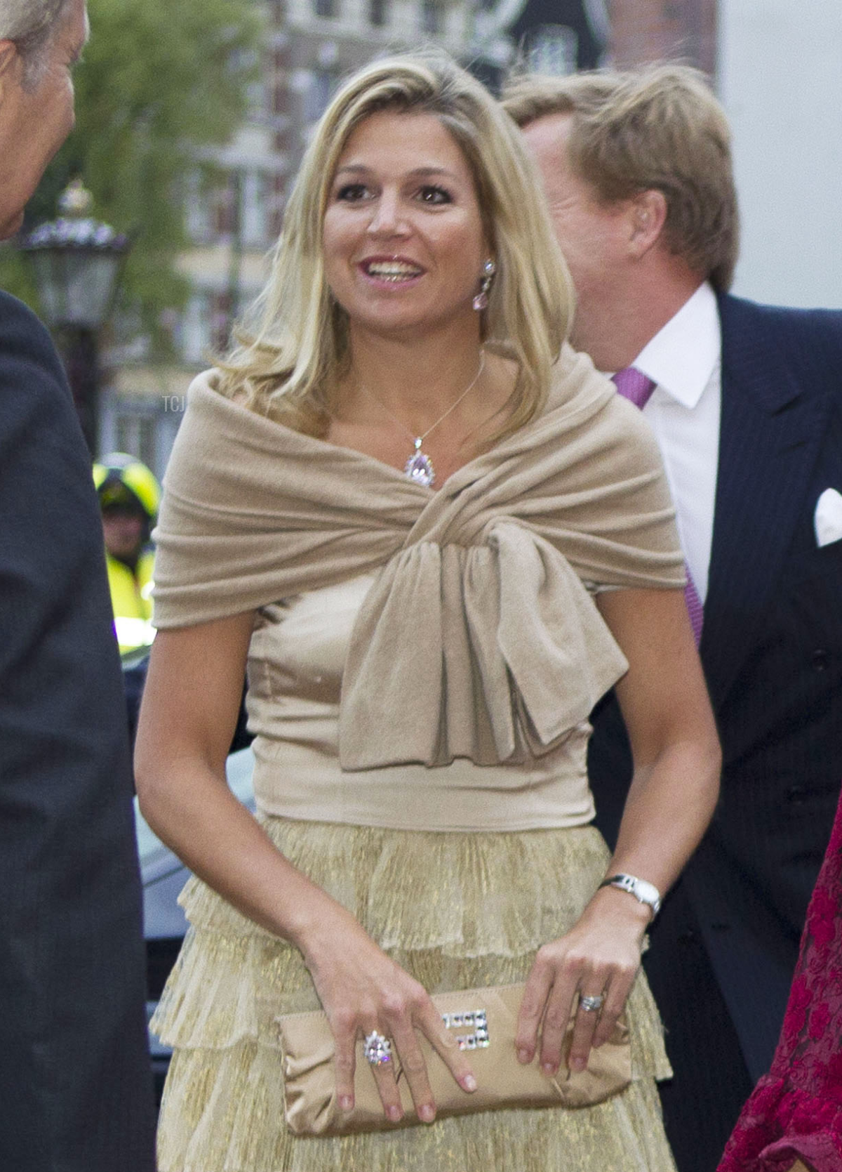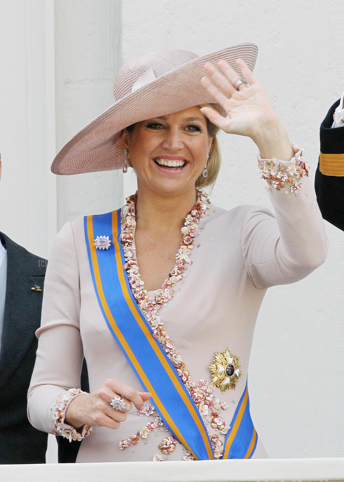 Maxima wore the small drop earrings, the ring, the brooch, and the bracelets for the abdication ceremony. She pinned the brooch, worn complete with its pendant, to the waist of her dress for the important moment.