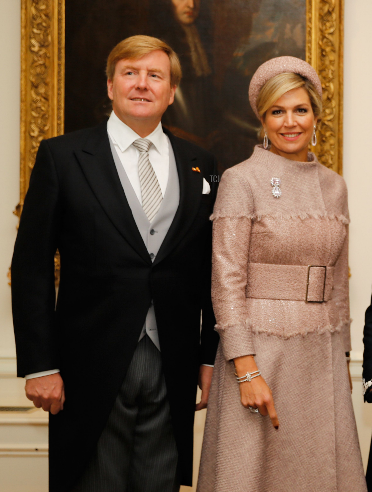 Another important moment for the kunzites came in October 2018, when Maxima wore the larger earrings, the brooch with its pendant, the bangle bracelets, and the ring for the official welcome ceremonies in London during the Dutch state visit to the United Kingdom.