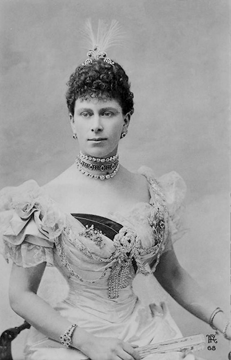 The bracelet was made by Carrington, a London jewelry firm, and presented to the princess at her home, White Lodge in Richmond. Eliot notes that Mary “was graciously pleased to accept the offering made to her on behalf of the county” and “expressed herself much pleased with the bracelet.” The inscription inside the bracelet—”From Cornwall, One and All, July 6, 1893″—serves as a permanent reminder of the piece’s provenance. In the portrait above, taken not long after the wedding, Mary wears the bracelet with other pieces of diamond and ruby jewelry.