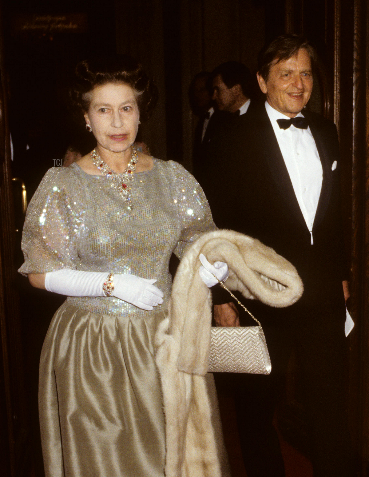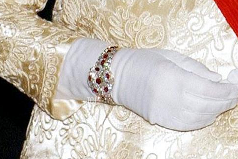 Here, in May 1983, the Queen wears the bracelet with the Greville Ruby Necklace and Queen Mary’s Ruby Cluster Earrings. The occasion was a trip to the opera house in Stockholm during her state visit to Sweden. She is accompanied by Prime Minister Olof Palme.