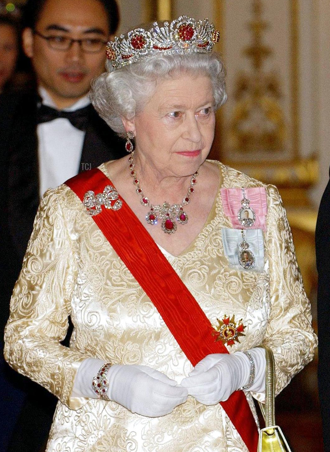 During a state visit from South Korean President Roh Moo-Hyun to London in December 2004, the Queen wore the Cornwall Rose of York Bracelet for a state banquet at Buckingham Palace. The rubies coordinated nicely with the red sash of her South Korean decoration, the Grand Order of Mugunghwa. She also wore the Burmese Ruby Tiara and the Baring Ruby Necklace, as well as the Dorset Bow Brooch, for the dinner.