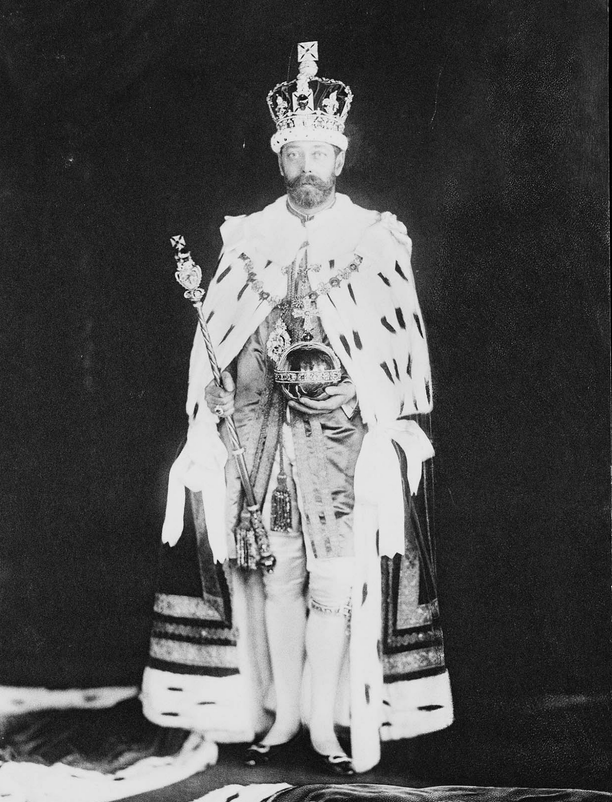 In this photographic portrait of King George V from his coronation celebrations in 1911, the Cullinan II gleams on the front of the crown for the first time. (It had replaced the Stuart Sapphire, now at the back of the crown, two years earlier.)