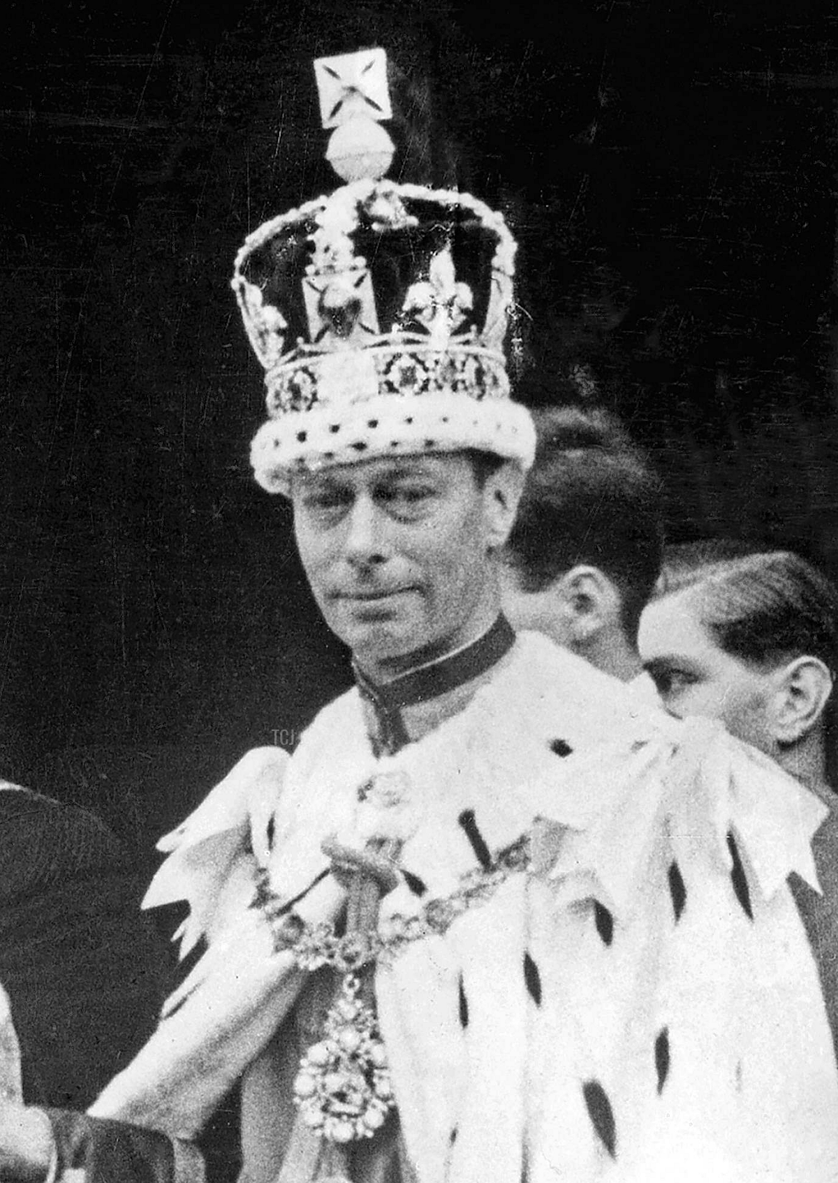 Here, King George VI wears the Imperial State Crown on the balcony at Buckingham Palace following his coronation in 1937. Also of note here: the special diamond-encrusted Lesser George, which likely dates to the reign of King George II, suspended from the collar of the Order of the Garter.