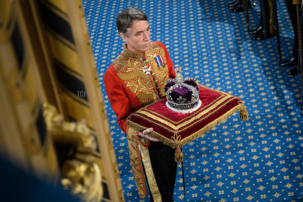 But the Imperial State Crown, an important symbol of the power and position of the monarch, is still present each time the Queen opens parliament. It arrives in the chamber on a velvet pillow carried by the Lord Great Chamberlain. (Since 1990, that’s been the 7th Marquess of Cholmondeley.) The crown sits beside the Queen’s throne as she makes her speech. When not in use, the crown resides with the rest of the crown jewels at the Tower of London.
